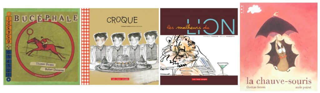 On trouve aussi dans sa production quelques ouvrages jeunesse avec des illustrateurices divers, il s’agit la plupart du temps de reprises de ses chansons en récit illustré. Il faut dire que son écriture s’y prête bien. J’ai retenu au moins cinq titres, un au Rouergue en 1998, croisant la chanson équestre Bucéphale avec des photos de Doisneau, une version illustrée de La Chauve souris par Aude Poirot en 2003 aux éditions Points de Suspension et trois aux éditions Les 400 coups en 2007-2008 (Les Malheurs du lion, Croque et Dugenou), éditeur qui a poussé le plus loin la collaboration. Aucun des illustrateurices n’a cependant de lien particulièrement fort à la bande dessinée, on ignore aussi la part de choix de Fersen dans le dessin, je l’estime minimale : un accord de principe sur suggestion de l’éditeur, il ne s’agit jamais que d’adaptation.